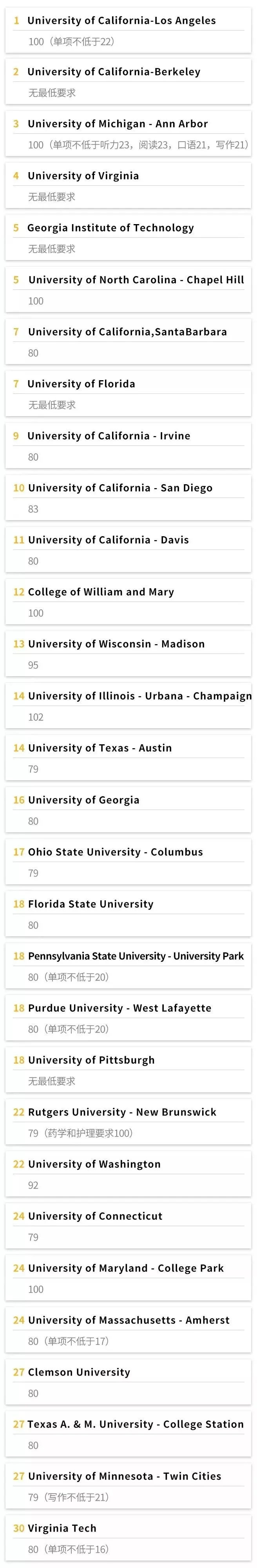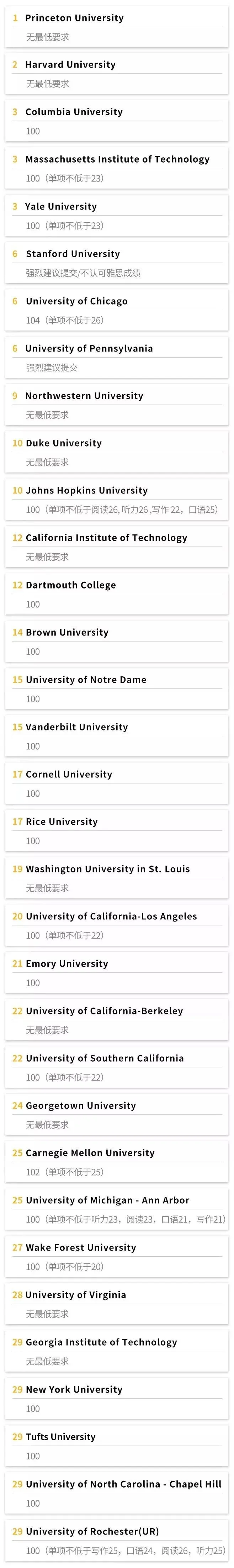 為了幫助各位小夥伴能夠更精準的選擇適合的學校,托福官方聯手 U.S.News重磅發佈全美綜合名校排行榜。並貼心地為大家標示出,各個名校的托福成績要求。幫助考生對照榜單,迅速篩選適合自己的院校。